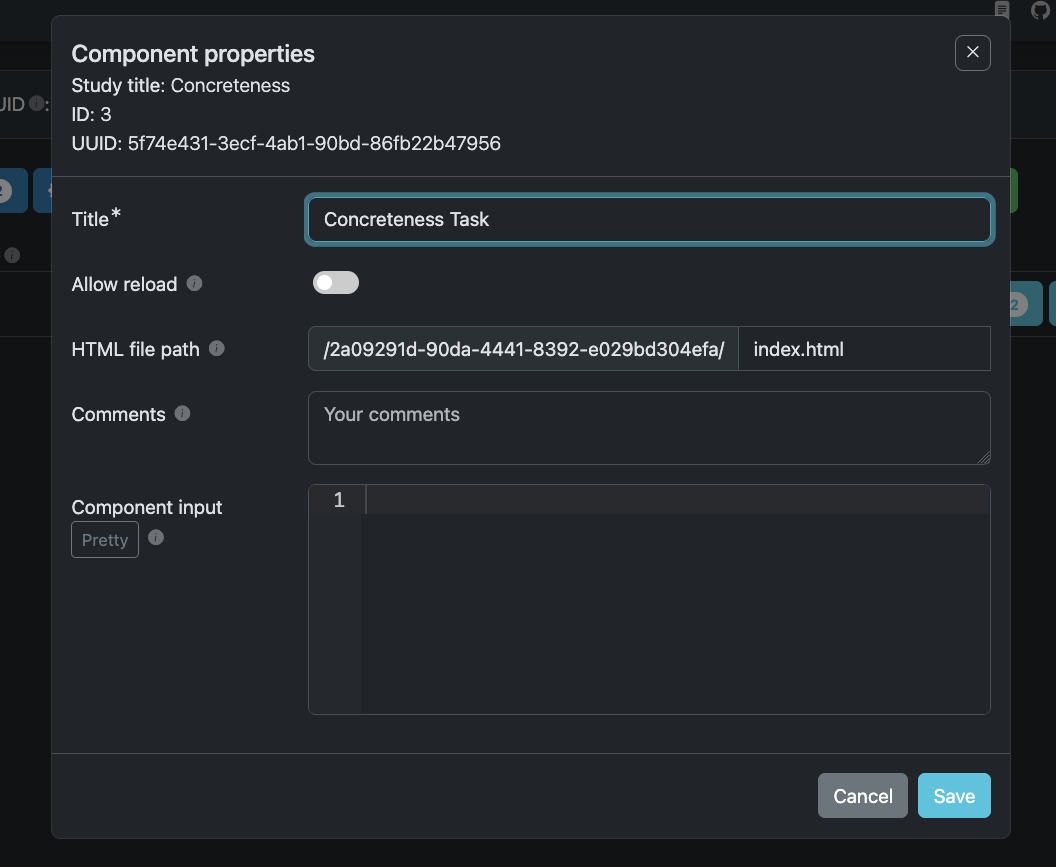 When you add a component to a study, you need to say where your html file is located. You’ll see a screen like this: